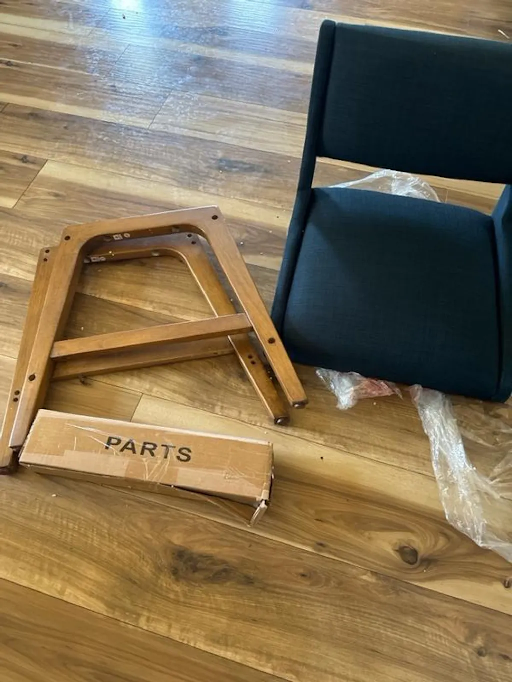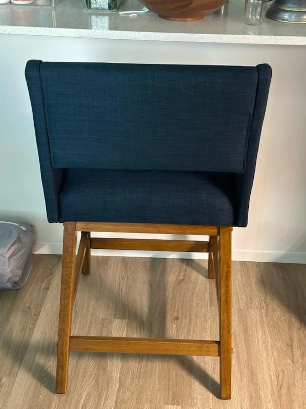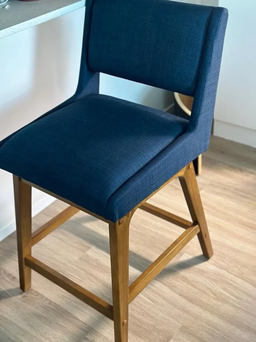 When I received this I was expecting a tan beige fabric counter stool but I’m actually loving this blue tone! It compliments the wood veneer beautifully. The chair was also pretty easy to put together and feels sturdy. The tool provided wasn’t the best and instructions were not that great but other then that I love the chair. Thank god there was not a ton of parts or I would’ve been lost ! The chair will blend with a lot of decor themes whether u want a rustic of modern look