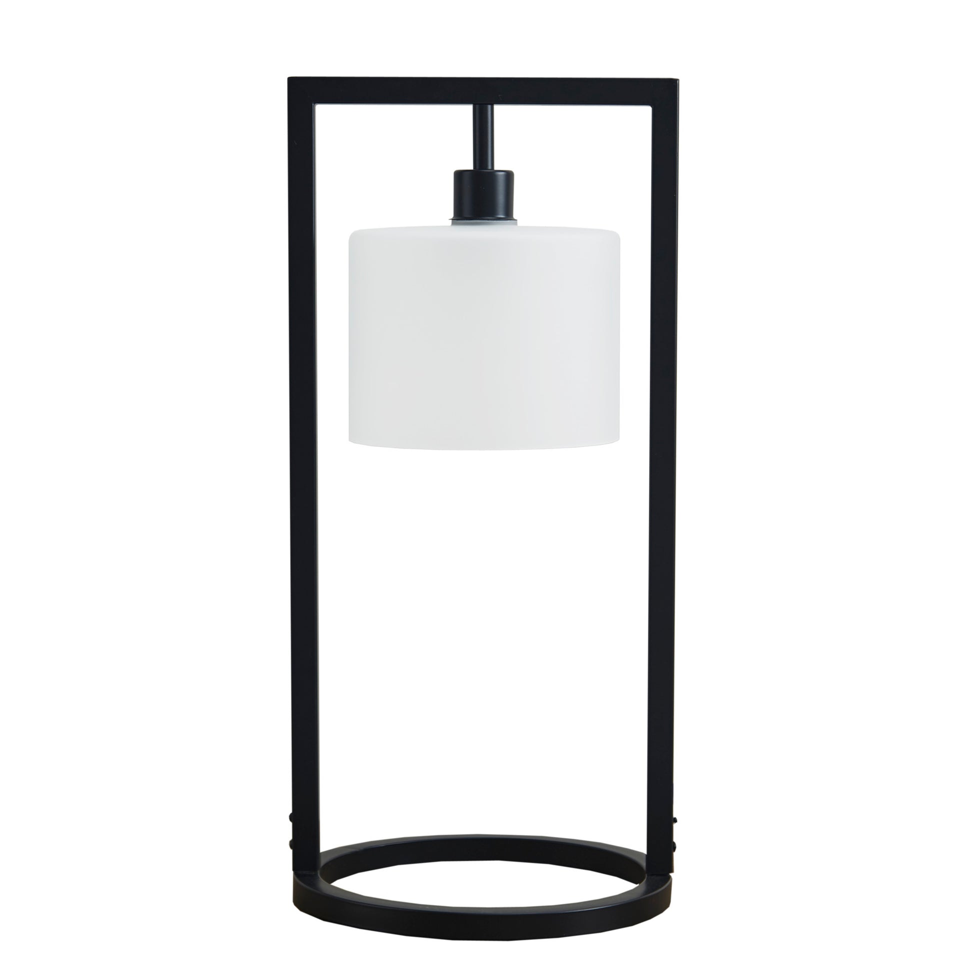 Illuminate your living room with the one-of-a-kind style of the INK+IVY Kittery Metal Table Lamp with Glass Drum Shade. Inspired by bold industrial designs, this table lamp features a single bulb down light in a rectangular open frame with a round base in a black finish.