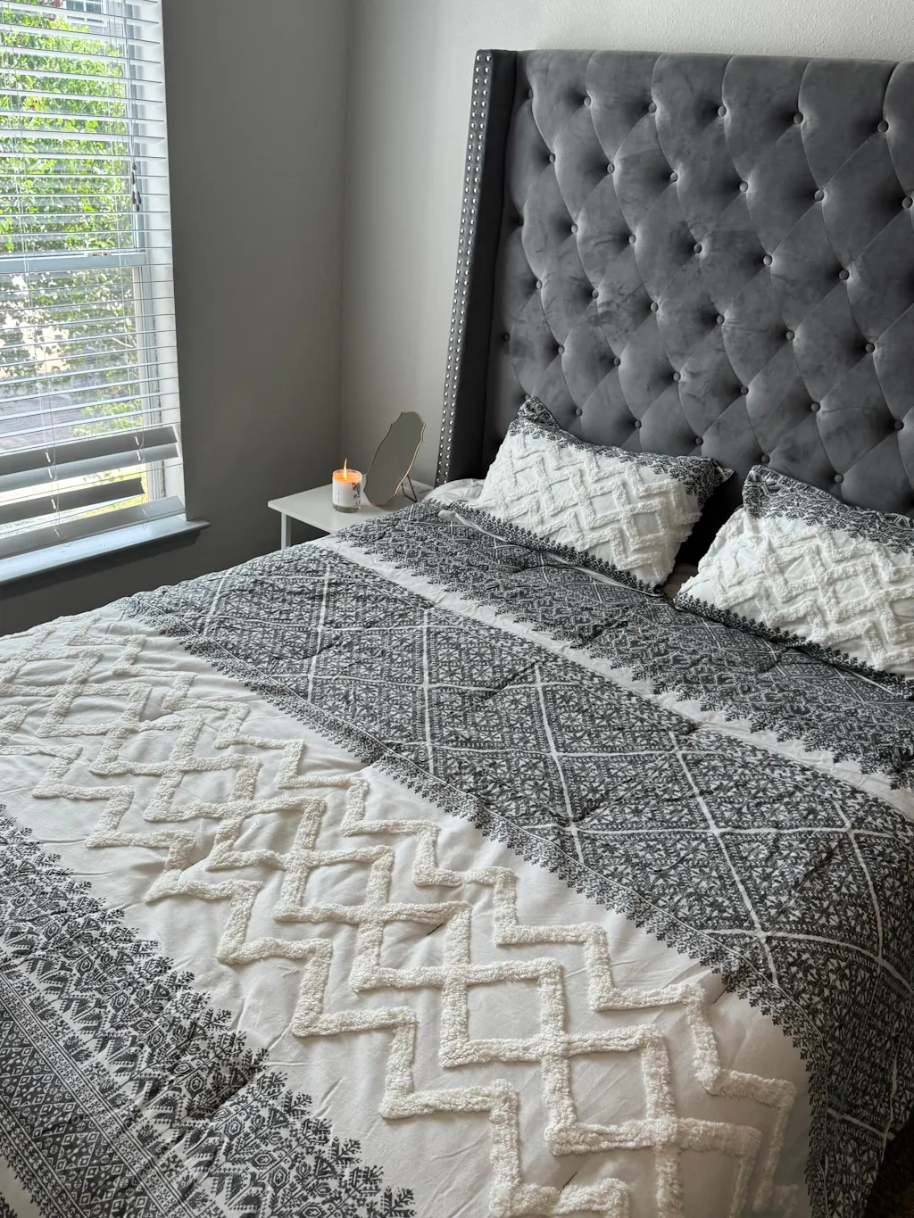 - Farmhouse cotton comforter set with tufted white chevron chenille