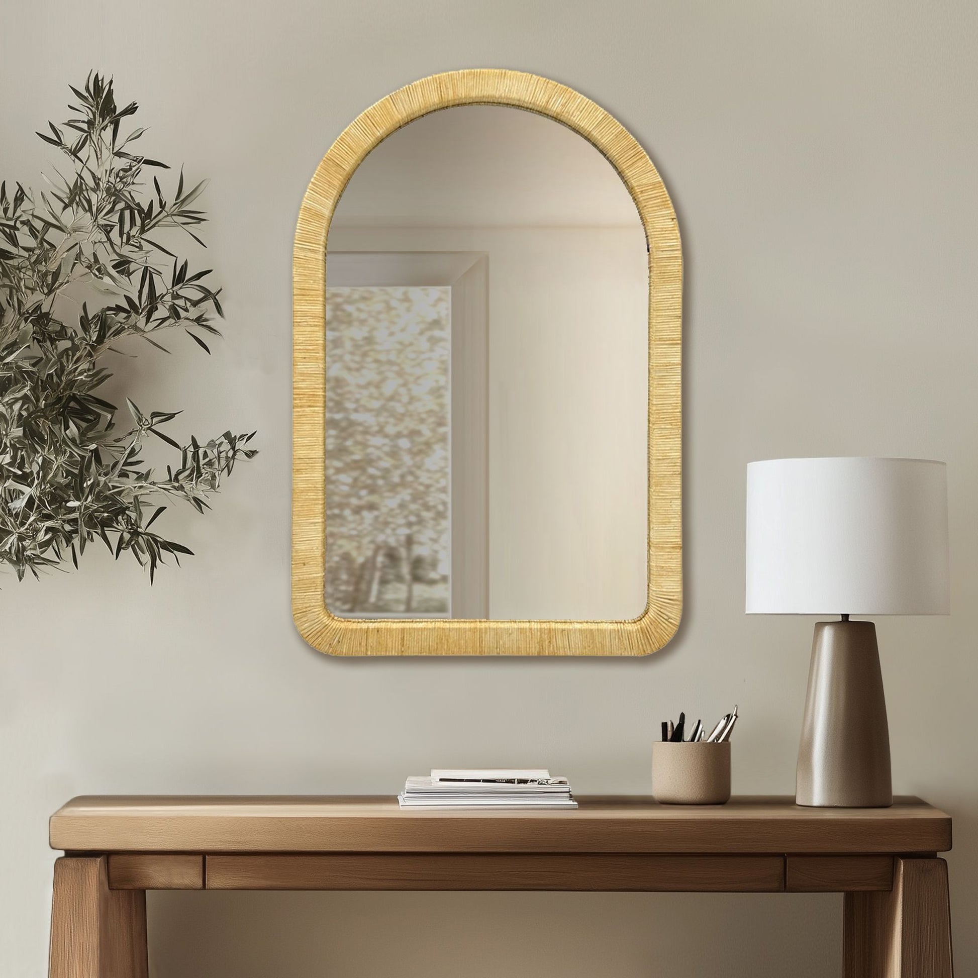 Elevate your space with this natural rattan round mirror. Each piece features unique color variations, mirrored glass on an MDF backing, and D-ring hangers Indoor use only; spot clean when needed.