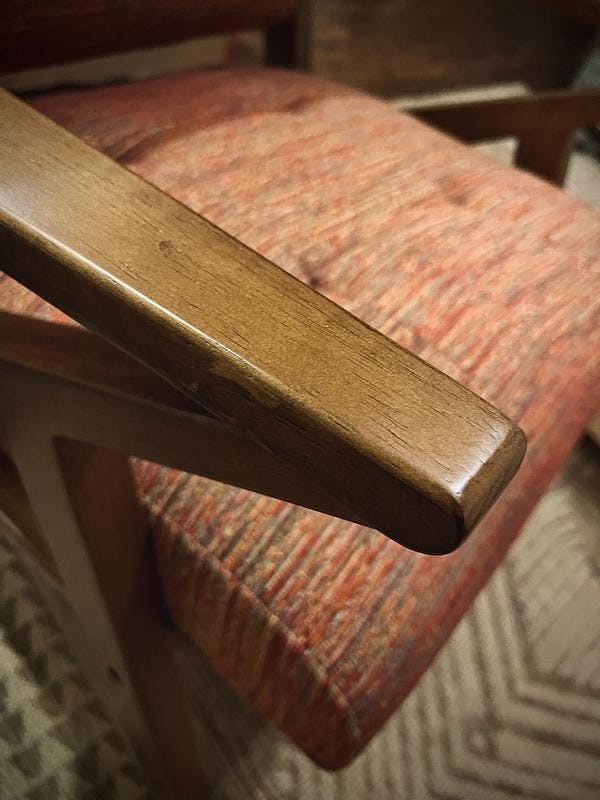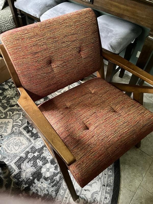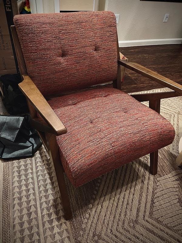This mid-century modern accent chair features angular wood arms, a sculptural silhouette, and a subtly tufted back. Upholstered for comfort and built to last, it's perfect for living rooms, bedrooms, or reading nooks—a stylish seating upgrade.